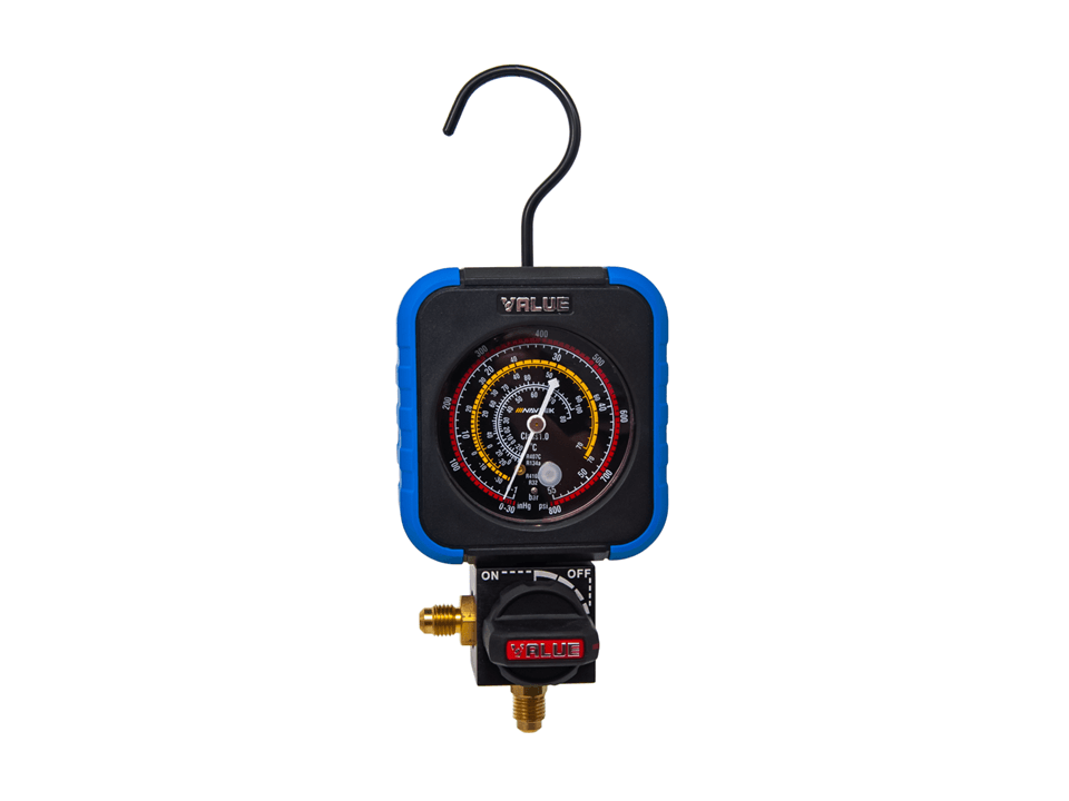 Pojedynczy manometr analogowy wysokiego ciśnienia przeznaczony do układów chłodniczych i klimatyzacyjnych.