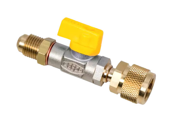 Zawór kulowy do węża serwisowego z popychaczem zaworowym i wymienialnym pokrętłem