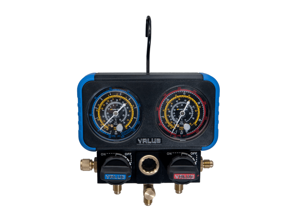 Zestaw podwójnych manometrów analogowych przeznaczony do układów chłodniczych i klimatyzacyjnych.